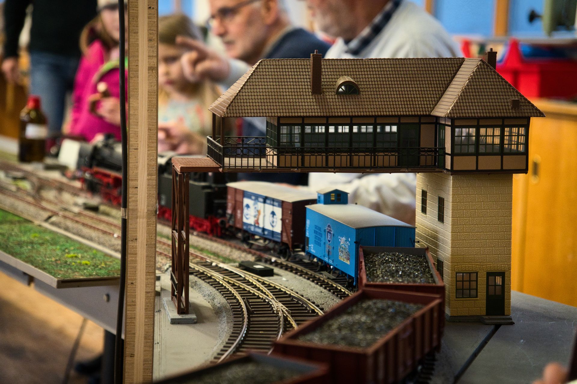Besonders beliebt war die Kinderanlage. Da herrschte einiges Gedränge, weil jeder einmal einen Zug fahren lassen wollte. Manche Kinder kamen sogar an mehreren Tagen. Auch etliche Mädchen waren interessiert und hatten Freude an der Modelleisenbahn. Die Züge fuhren nicht nur im Kreis herum, sondern es wurde auch rangiert um Züge und Loks auszuwechseln. Besonders beliebt waren die Pfiffe und das Läuten der Lokomotiven. Da die Spielanlage auch in kleineren Räumen aufgebaut werden kann, ist beabsichtigt, öfter Kindern die Gelegenheit zum Eisenbahn-Spielen zu geben.